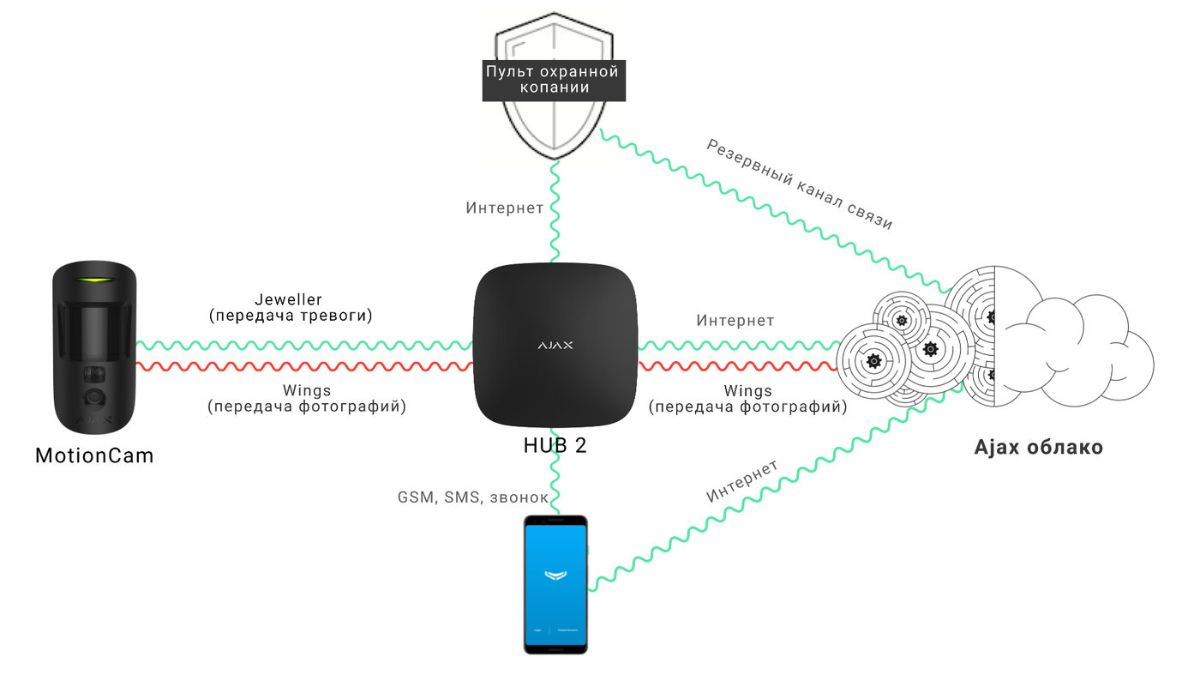 || Датчик фотофиксации MotionCam и централь Hub 2 связываются друг с другом по защищенному протоколу Jeweller, а также по протоколу Wings для передачи фотографий.